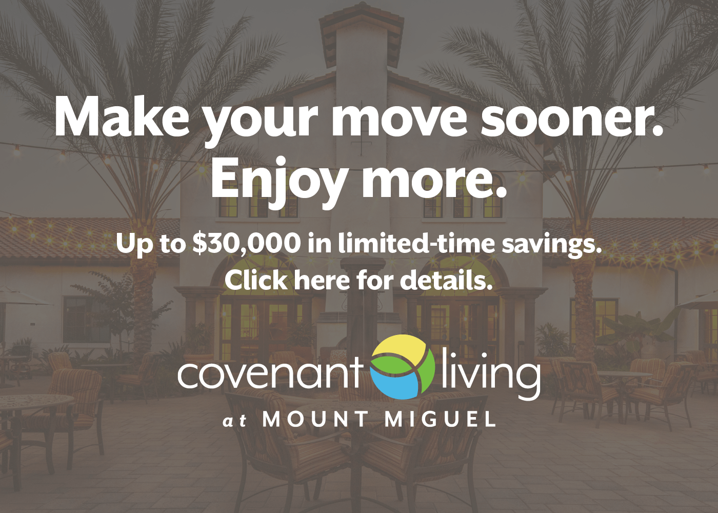 Covenant Living at Mount Miguel’s charming Spring Valley location is the setting for our uniquely spiritual Southern California, 62 and better, retirement community. Here, you’ll live at the edge of Sweetwater reservoir with the mountains in the distance—just minutes from fantastic cultural arts, dining and shopping opportunities. City-lovers will enjoy our proximity to the cultural sophistication and year-round vibrancy of San Diego.